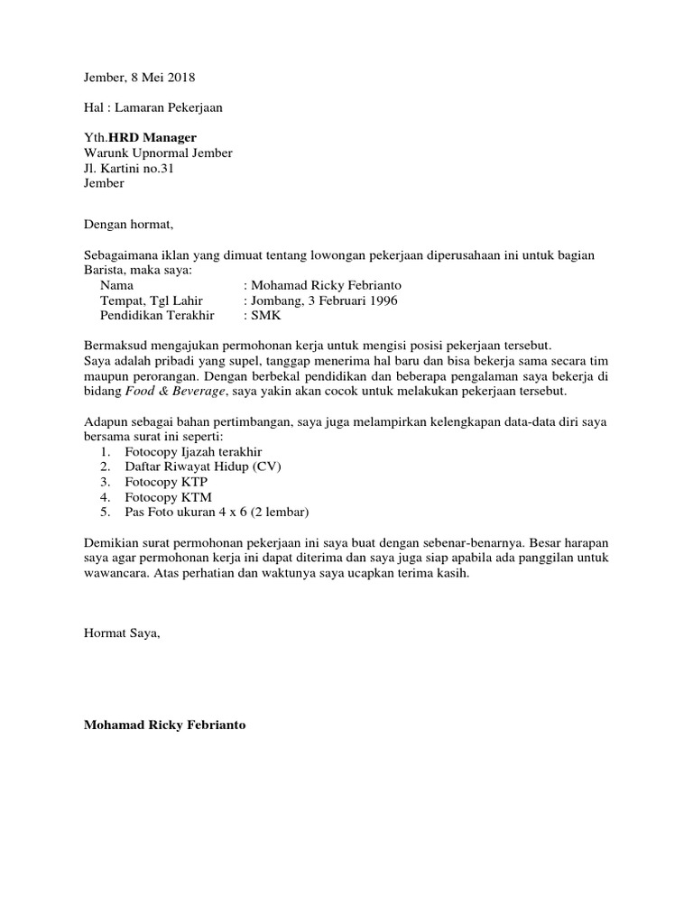 Contoh Surat Lamaran Kerja Di Cafe Sebagai Barista Lampiran. Contoh surat lamaran kerja daftar riwayat hidup cvresume Sample Job Application Letter including resume job application cover letter and curriculum vitae. Artikel ini bisa menjadi referensi Anda ketika.