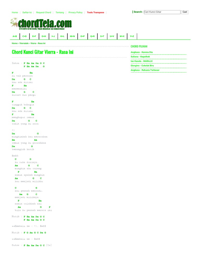 Chordtela vierra rasa ini. C G di mana kamu di mana F G. Chords ratings diagrams and lyrics. Chord Gitar Kunci Gitar Indonesia - Rasa Ini by Vierra -.